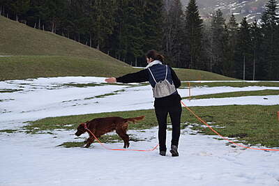 - Es werden teilweise Einzelübungen durchgeführt. Die dann nicht involvierten Teilnehmer können dies als Selbststudium ohne den eigenen Hund mitverfolgen. Dazu ist es notwendig, das in dieser Zeit der eigene Hund im Auto oder in einer Box untergebracht werden kann.